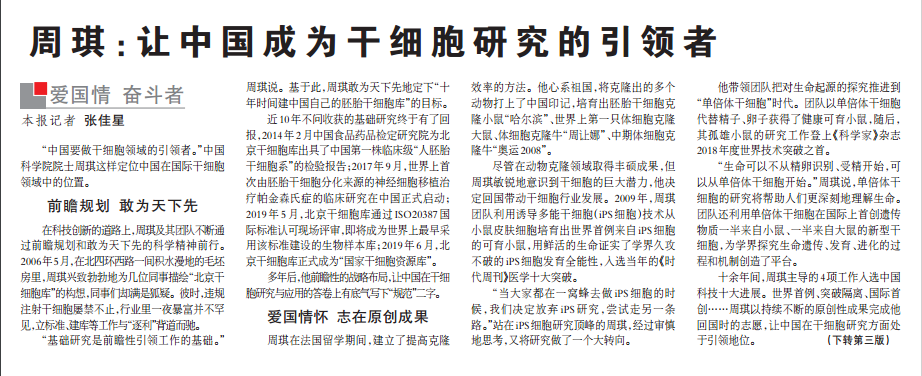 《科技日?qǐng)?bào)》周琪:讓中國(guó)成為干細(xì)胞研究的引領(lǐng)者
