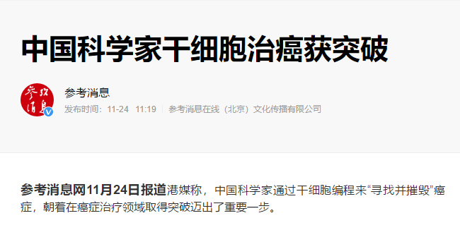 參考消息網(wǎng)11月24日?qǐng)?bào)道港媒稱,中國(guó)科學(xué)家通過(guò)干細(xì)胞編程來(lái)“尋找并摧毀”癌癥,朝著在癌癥治療領(lǐng)域取得突破邁出了重要一步。據(jù)…